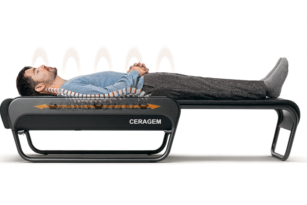 Szolgáltatásunk középpontjában a Ceragem Master V4 hőterápiás masszázságy áll, emely egy csúcstechnológiás rendszer, ami ötvözi a masszázst, az akupresszúrát, a hőterápiát és a gerincnyújtó technikákat, mindezt egy teljesen automatizált, nyugtató kezelési folyamatban.
